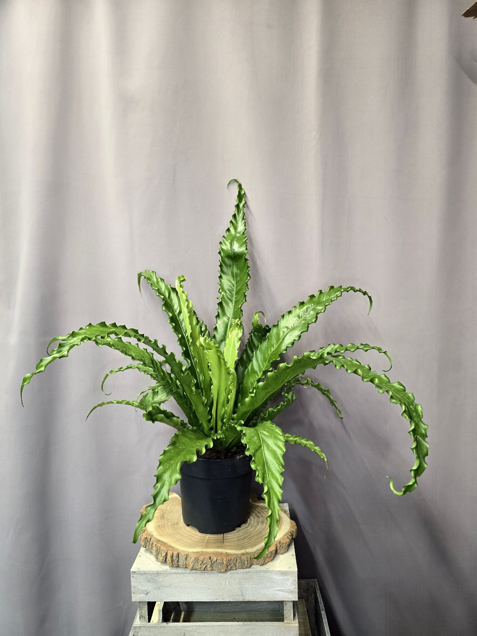 Az Asplenium Osaka madárfészekpáfrány egy különleges megjelenésű páfrányfajta, amely széles, fényes felületű és enyhén hullámos szélű leveleivel friss, természetközeli hangulatot teremt a lakásban. A levelek tölcsérszerűen, rozettába rendeződnek, innen ered a madárfészekpáfrány elnevezés. Középső levélere sötétebb árnyalatú lehet, ami finom kontrasztot ad a világosabb zöld lombhoz.