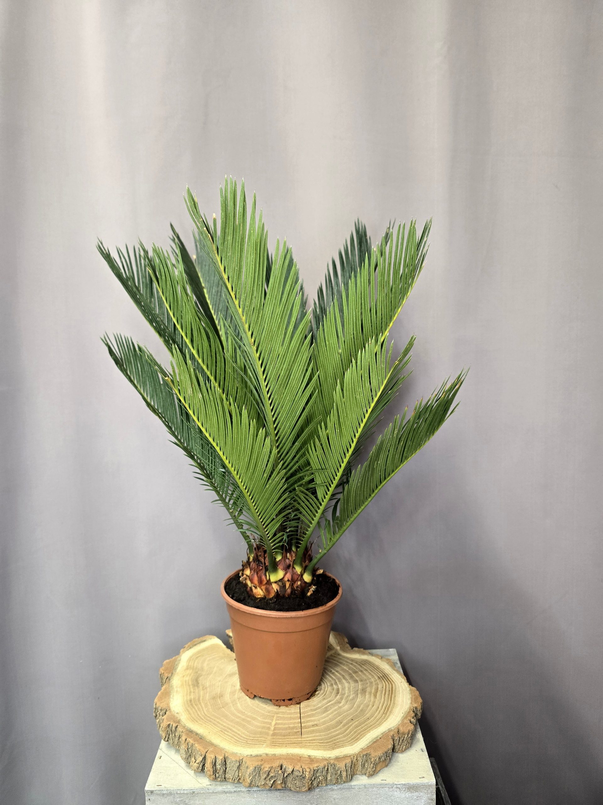 A Cycas revoluta egy ősi eredetű, rendkívül karakteres megjelenésű dísznövény, amely merev tartású, fényes, sötétzöld leveleivel egzotikus hangulatot teremt világos belső terekben és télikertekben. Bár formavilága pálmaszerű, botanikailag a cikászok közé tartozik, és különleges felépítésével azonnal fókuszponttá válik. Vastag, pikkelyes törzséből sugarasan elhelyezkedő levélrozettát fejleszt, amely szabályos, szimmetrikus szerkezetet alkot, és kifejezetten rendezett, elegáns megjelenést biztosít.