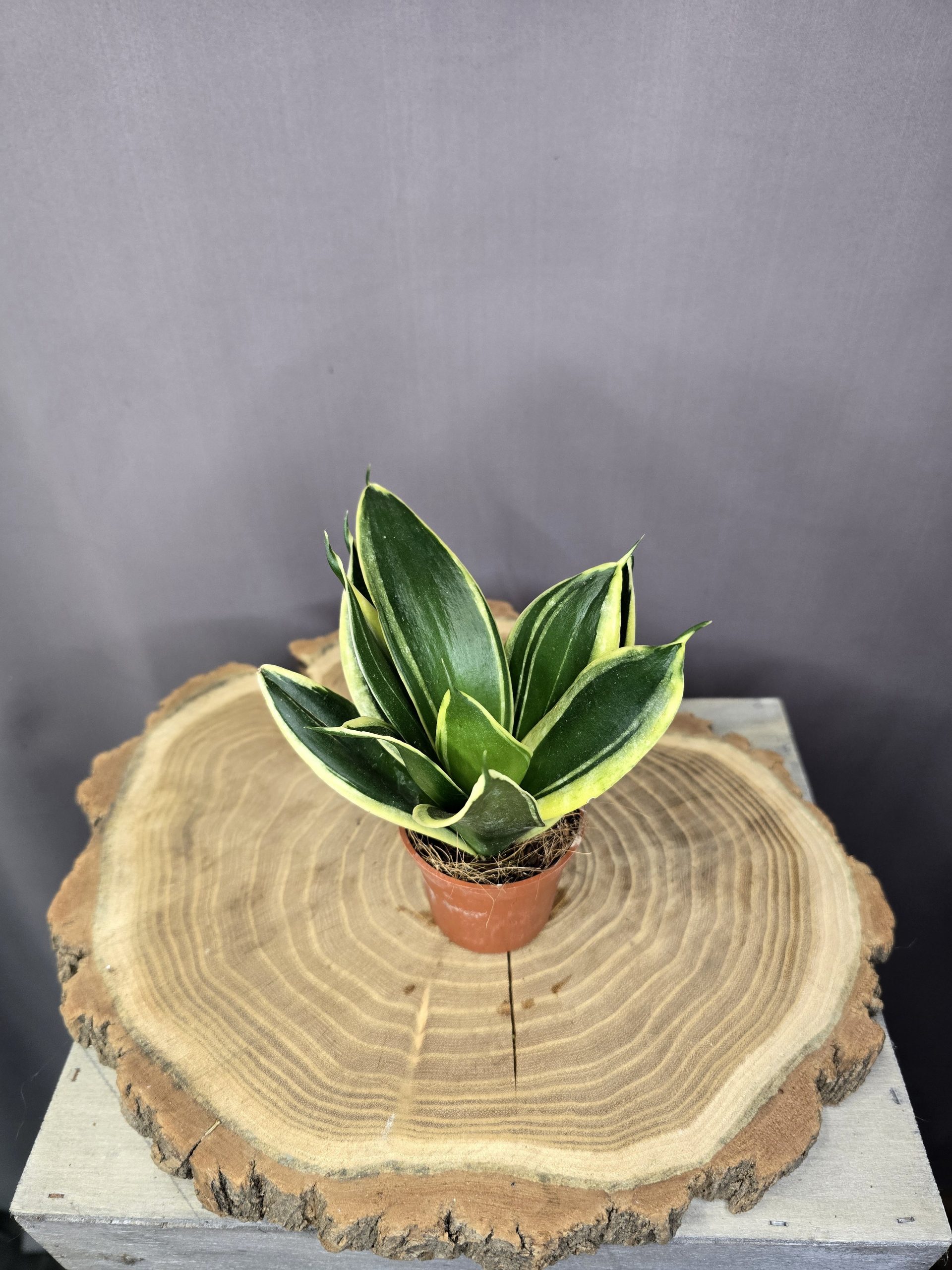 A Sansevieria Golden Hahnii Black szobanövény egy különleges megjelenésű, alacsony termetű sansevieria fajta, amely sötétzöld, szinte feketébe hajló leveleivel és finom aranysárga szegélyével elegáns, modern hatást kelt. Rövid, széles levelei sűrű rozettába rendeződnek, így a növény tömör, rendezett formát mutat. Kontrasztos színvilága miatt önmagában is hangsúlyos dísze lehet a beltérnek.