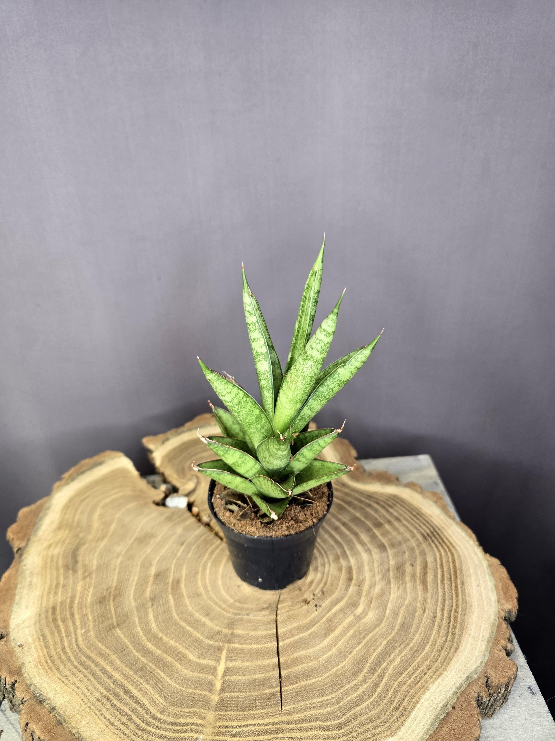 A Sansevieria trifasciata Pineapple szobanövény egy igazán különleges megjelenésű anyósnyelv fajta, amely nevét jellegzetes, ananászra emlékeztető, rozettás növekedési formájáról kapta. A levelek rövidebbek, vastagabbak és sűrűn, tölcsérszerűen rendeződnek, így a növény kompakt, szoborszerű hatást kelt. Ez az egyedi forma modern, letisztult megjelenést biztosít, amely önmagában is hangsúlyos dekorációs elem lehet.