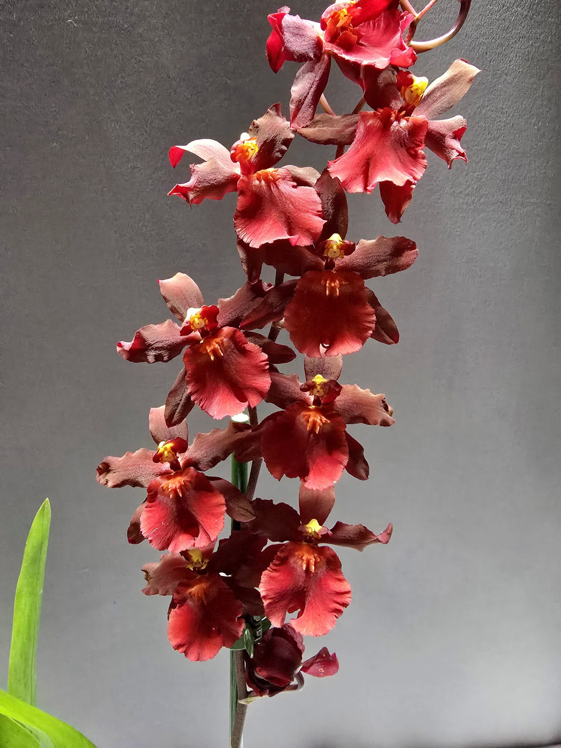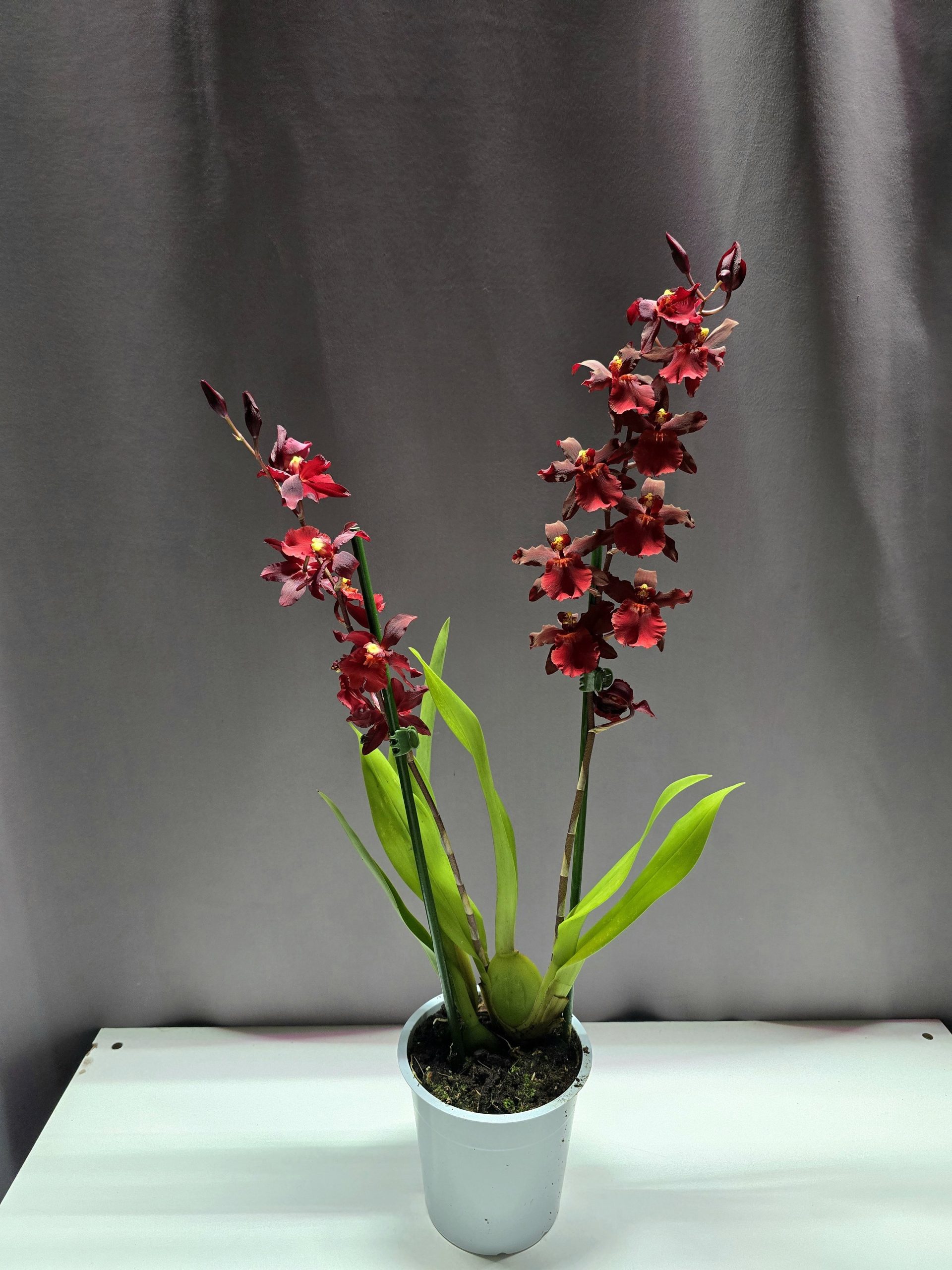 Vuylstekeara Cambria piros virágú cserepes orchidea zöld levelekkelVuylstekeara Cambria